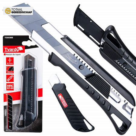 Durable SK2H hardened steel blade – with a hardness level of HRC 62-64, it performs excellently with a variety of materials, from cardboard to thicker plastics. The blade's 0.7 mm thickness and 25 mm width ensure stability and resistance to breakage.
