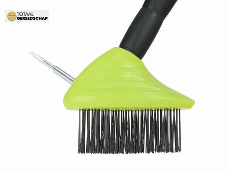 Wire Brush with Scraper for cobblestone paving with a plastic handle is a tool designed for effective cleaning and removal of dirt from the surface of cobblestone paving in yards, sidewalks, terraces, or other paved areas.