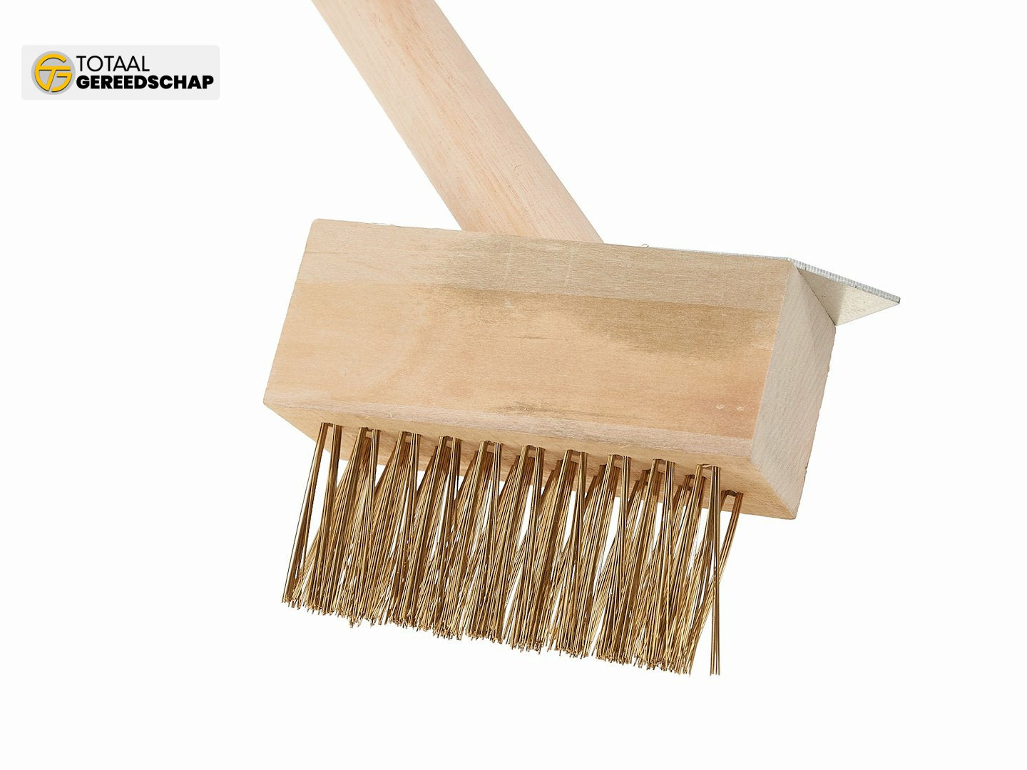 Wire Brush with Scraper for cobblestone paving with a wooden handle is a tool designed for effective cleaning and removal of dirt from the surface of cobblestone paving in yards, sidewalks, terraces, or other paved areas.