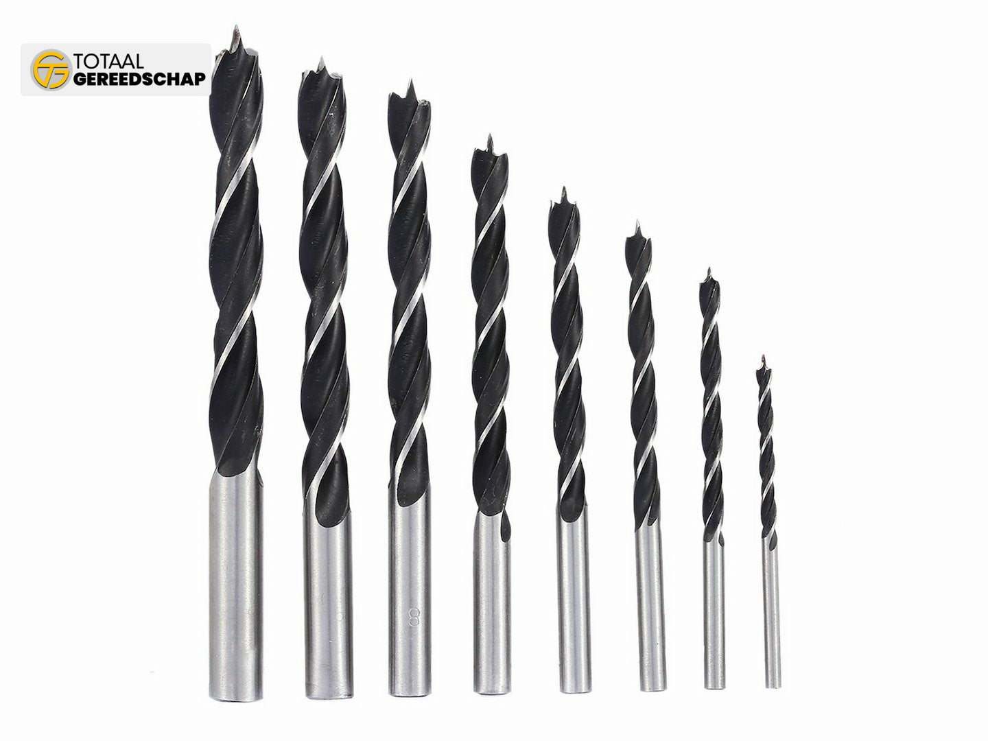Set of 8 spiral wood drill bits 3 - 10 mm. The set includes drill bits with diameters of 3, 4, 5, 6, 7, 8, 9, 10 mm.