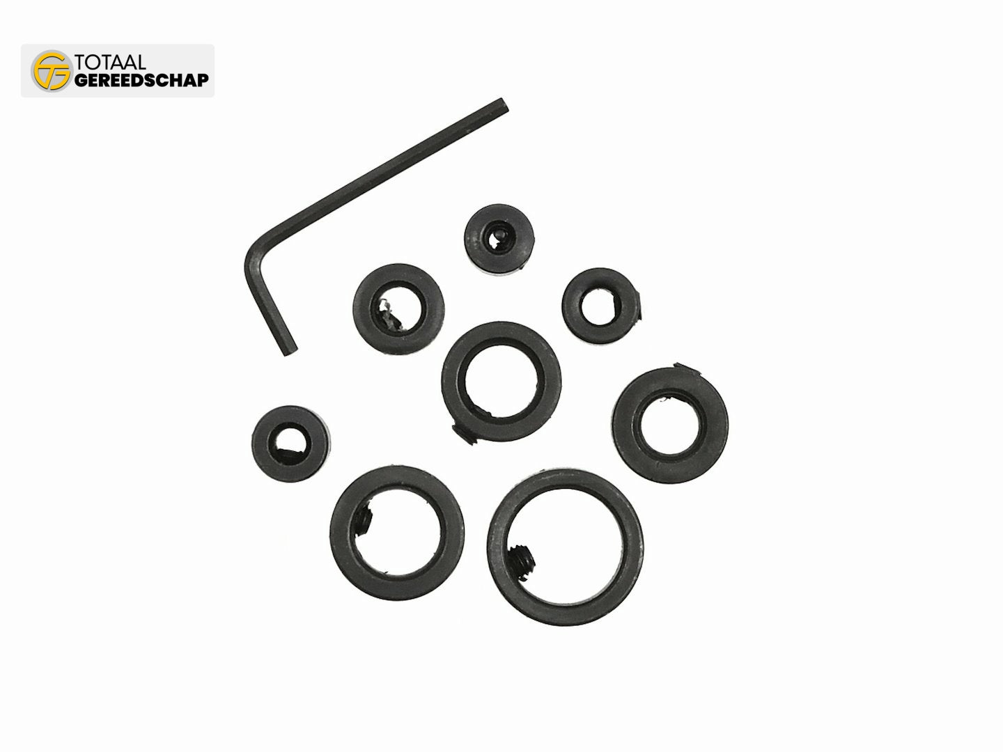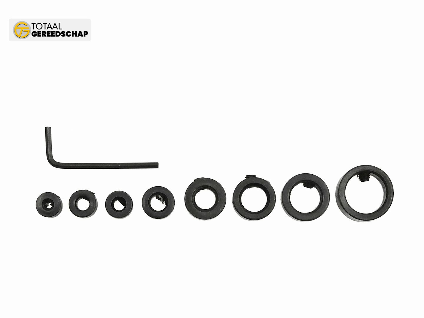 - The set includes eight stops for drill bits with diameters 3, 4, 5, 6, 8, 10, 12, 16 mm