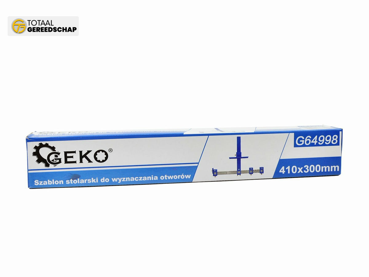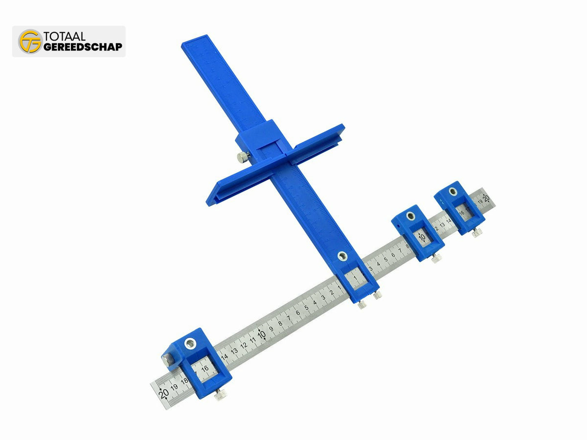 Carpentry template with guide, designed for making precise holes in wood, MDF boards, chipboard, plastics, and metal. Equipped with two guides, the plastic guide is used to set the distance of holes from the edge of the processed element, while the aluminum guide is intended for precise hole spacing adjustment.